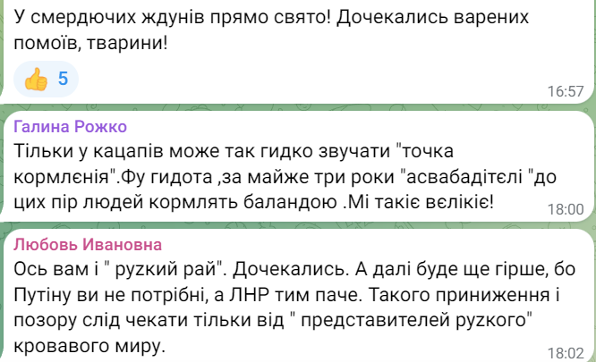 Реакція користувачів у соціальних мережах на такі події була негативною. Багато коментаторів саркастично вказують на принизливе становище, в якому опинилися мешканці міста: "Прямо свято! Дочекалися варених помиїв, тварини!", - зазначає один із користувачів. Інші додають: "Тільки в окупантів може так гидко звучати "точка годування". Фу гидота!".