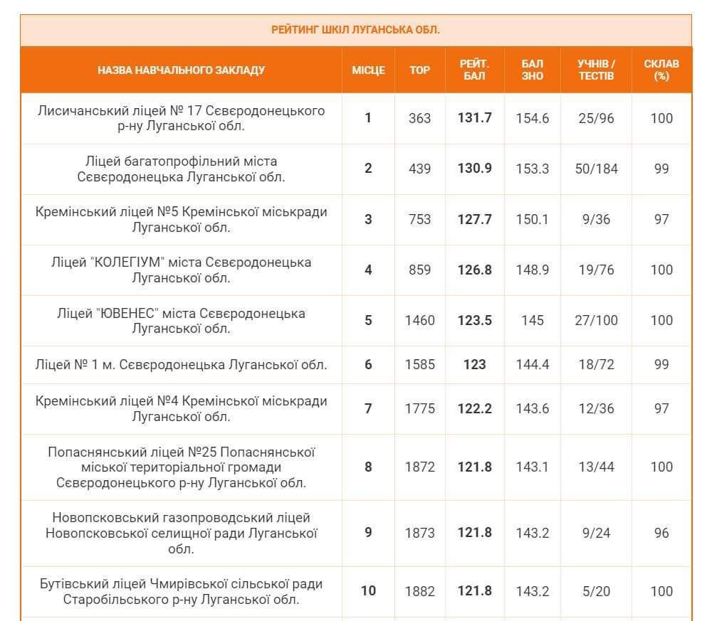 Список лідерів також доповнили Попаснянський ліцей № 25, Новопсковський газопроводський ліцей та Бутівський ліцей, які увійшли до топ-10 найкращих шкіл області. Ці результати підкреслюють загальний високий рівень освіти в Луганській області, попри складні умови, в яких працюють заклади через тривалу військову агресію та окупацію частини регіону.