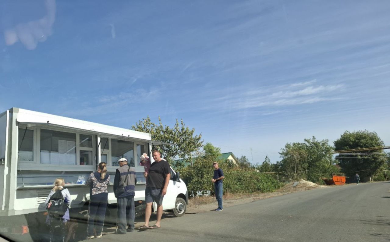 Замість працюючого магазину до селища тепер приїжджає "магазин на колесах". Фото було зроблено нещодавно, 27 вересня 2024 року. Мешканці Воєводівки звикають до нової форми торгівлі. Щоправда, невідомо, скільки жителів залишається у населеному пункті та чи мають вони транспортну можливість виїжджати до Сєвєрскодонецька або інших міст.