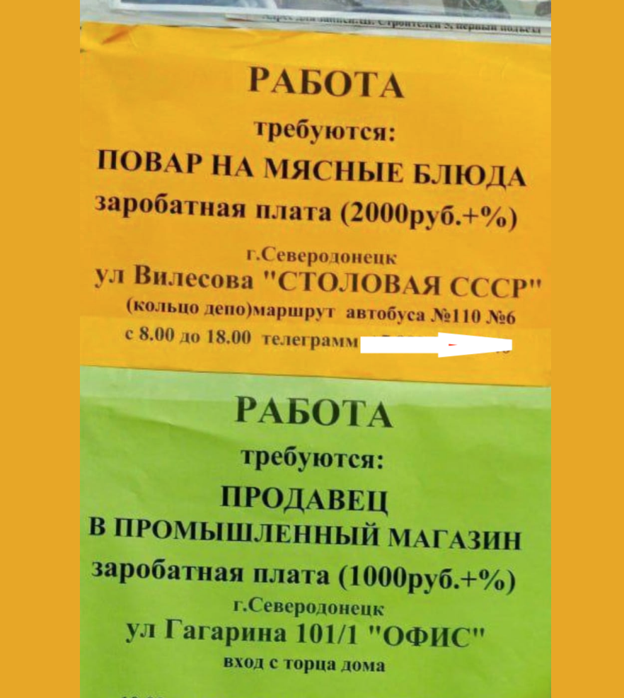 Судячи з оголошень, кухарям пропонують 2000 рублів +%, а продавцям - 1000 рублів +%. Згідно з офіційним курсом, 1000 рублів - це трохи більше 430 гривень. Невідомо, скільки становить "відсоток", але вкрай малоймовірно, що хоча б у 10 разів перевищує "ставку".