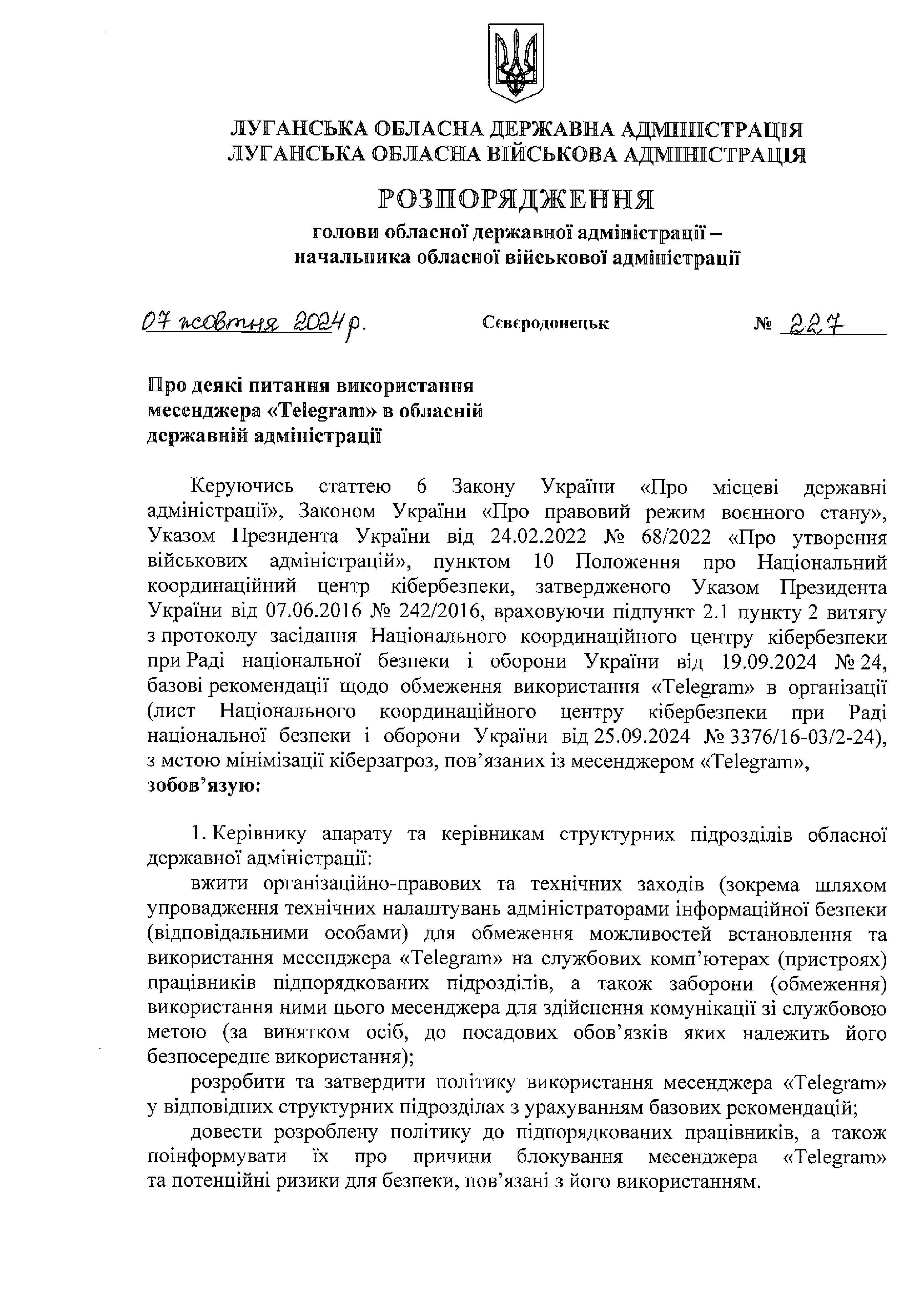 Працівникам Луганської обласної військової адміністрації (ОВА) заборонено використовувати месенджер Telegram у службових цілях.