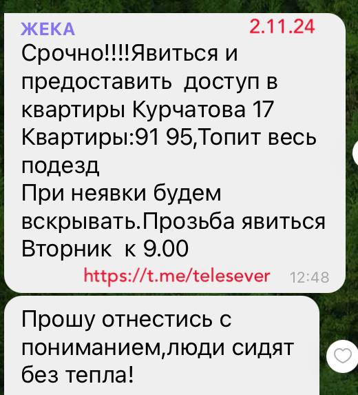 "Терміново з'явитися і дати доступ до квартир на Курчатова, 17 91 і 95. Топить весь під'їзд. За неявки розкриватимемо", - пишуть стривожені жителі у коментарях.