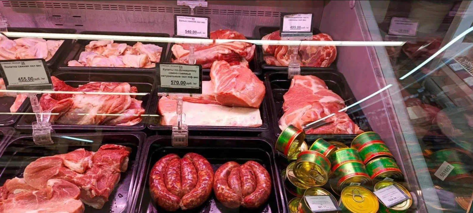 - Свинина продається за ціною від 455 до 570 рублів за кілограм (176,43 – 221,02 гривні),