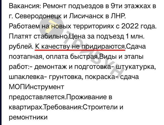 Російські підрядники пропонують працювати над ремонтом під’їздів дев’ятиповерхових будинків у Сіверськодонецьку та Лисичанську. За один під’їзд обіцяють до мільйона рублів, надають інструменти та навіть житло. Щоправда, як виявилося, це житло нерідко - квартири місцевих мешканців, які залишили міста через окупацію.