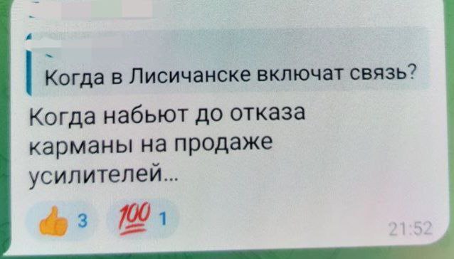 Ще одна серйозна проблема - повна відсутність мобільного зв'язку та інтернету в Лисичанську й багатьох інших окупованих містах Луганщини. Люди масово запитують у чатах, коли можна очікувати на відновлення зв'язку. Відповіді звучать саркастично: