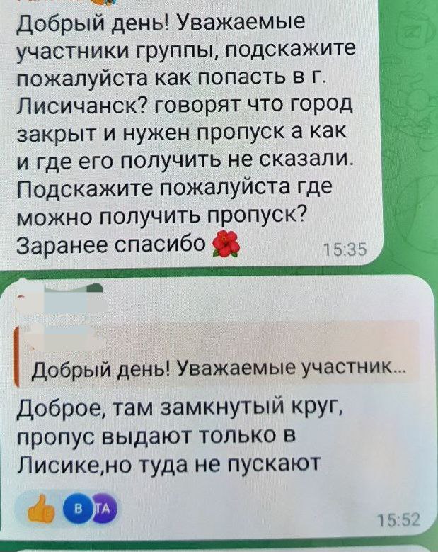 У соціальних мережах та чатах мешканці, які намагаються повернутися до Лисичанська, обговорюють, як отримати пропуск, передає Час Пік.