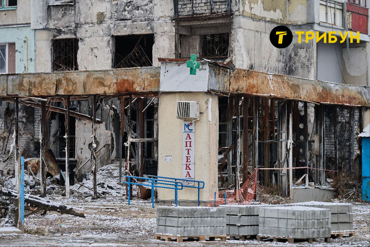 На фото видно, що значна частина міської інфраструктури залишається в занедбаному стані. Багатоповерхові будинки пошкоджені, фасади обвалені, а вікна багатьох квартир затягнуті плівкою. Вулиці виглядають порожніми, що підкреслює скорочення населення внаслідок окупації, евакуації та бойових дій.