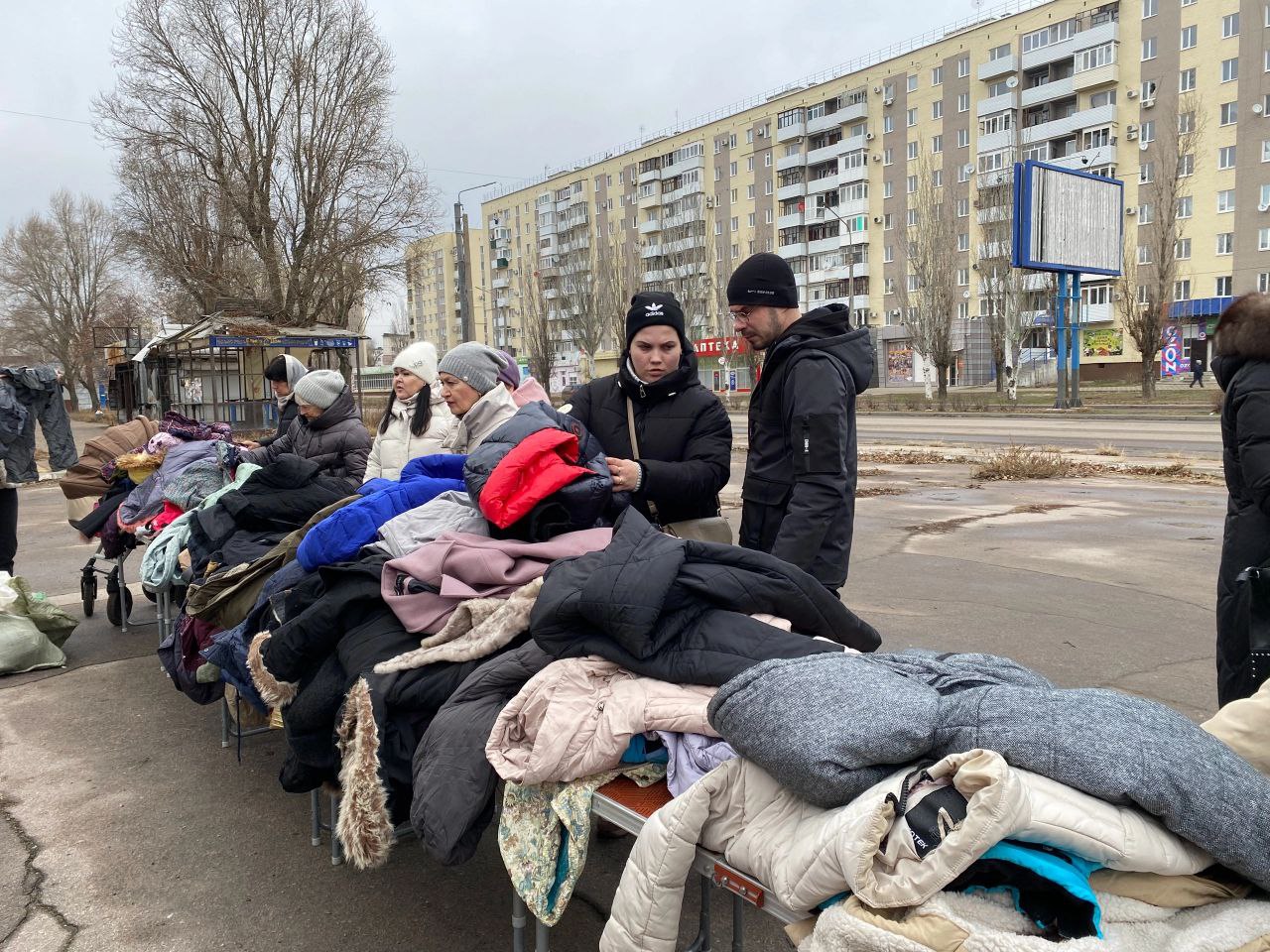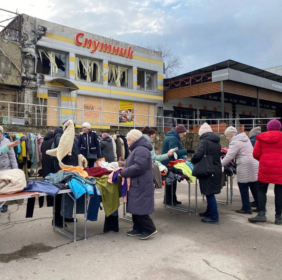 На фото можна побачити десятки людей, які оглядають запропонований одяг. Серед них переважають жінки середнього і похилого віку, кілька чоловіків, а також кілька дітей. Одяг, який надається, не новий, але, судячи з виразу облич людей, будь-яка допомога зараз є дуже цінною. Щоб отримати речі, люди мають записуватися у списки.