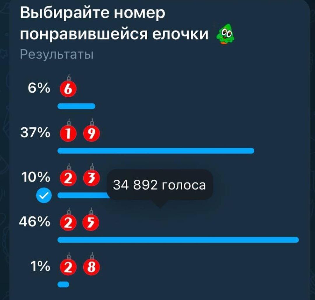 У фіналі конкурсу змагалися п’ять ялинок, і перемогу здобула новорічна ялинка Сіверськодонецька, за яку проголосувало понад 35 тисяч осіб — 46% від загальної кількості голосів серед майже 77 тисяч учасників, повідомляє Час Пік.