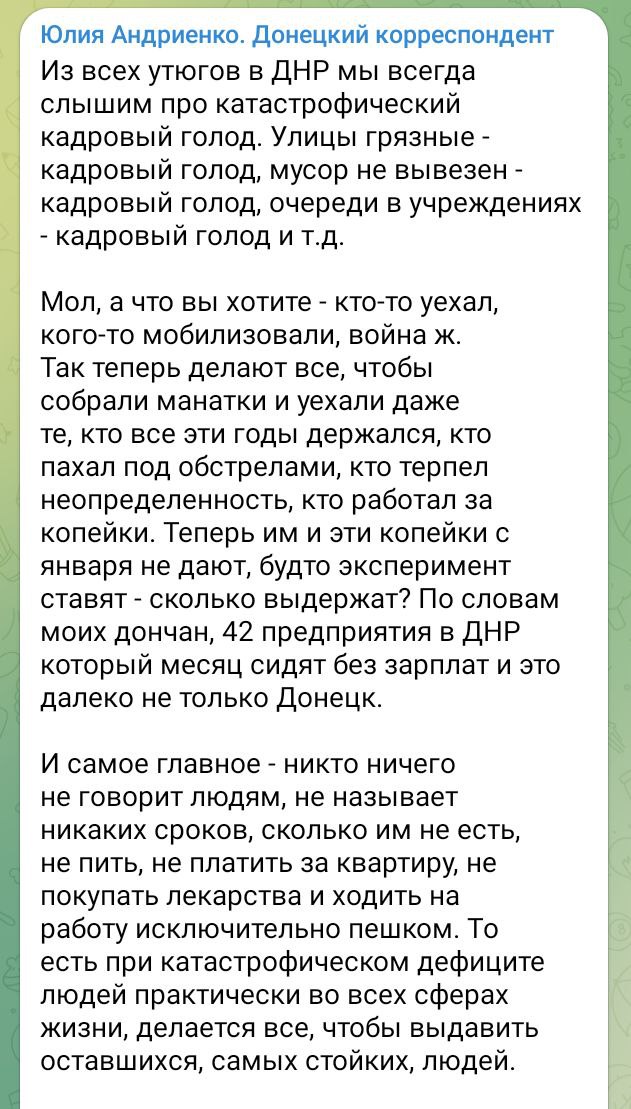 За його словами, понад 42 підприємства в "ДНР" не виплачують зарплати вже кілька місяців, і це не лише у Донецьку. Людям не пояснюють, коли ситуація зміниться, не називають жодних термінів, не надають підтримки.