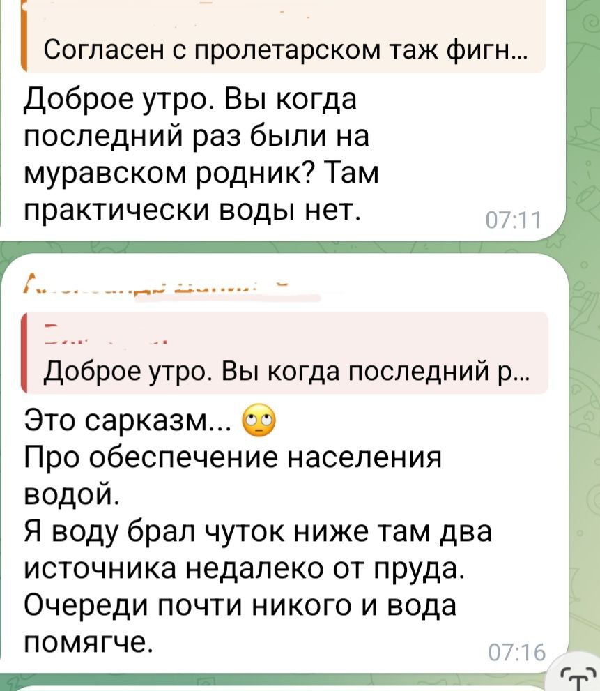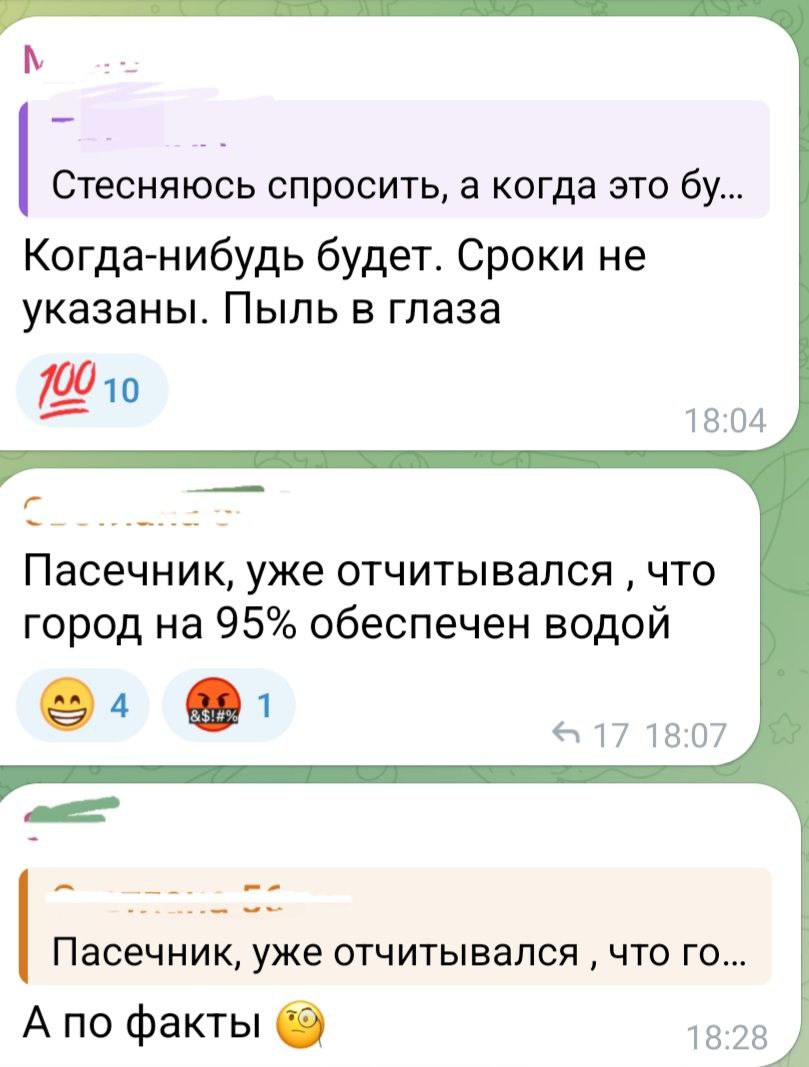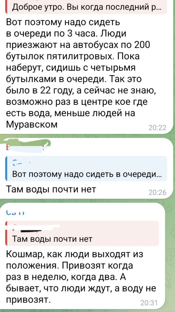 Люди також обговорюють, де ще можна набрати воду, поділяючись інформацією про доступні джерела, в яких ще є вода. Це свідчить про катастрофічну ситуацію з водопостачанням у Лисичанську, де обіцянки окупантів не відповідають реальному становищу справ.