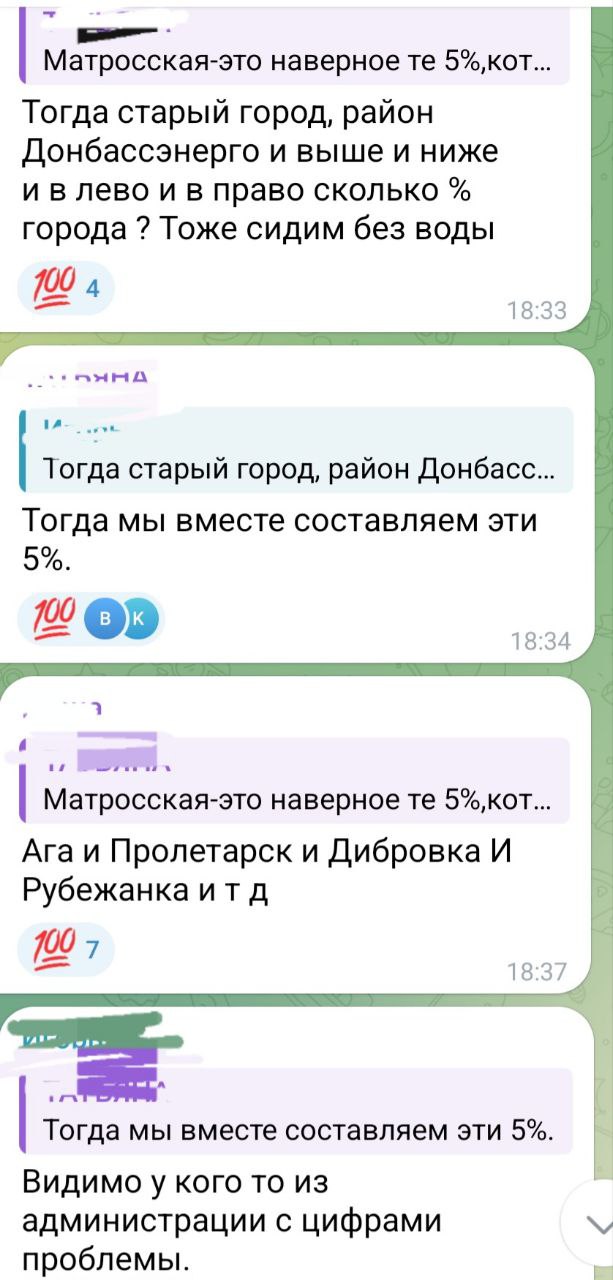 Окремі райони, такі як старе місто, район "Донбасенерго", Пролетарськ, Дібровка тощо, досі не отримують воду. Деяким мешканцям не привозили воду більше тижня, а в деяких районах навіть не вистачає води для доставки на одну "стоянку".
