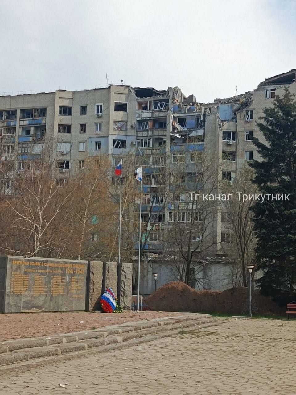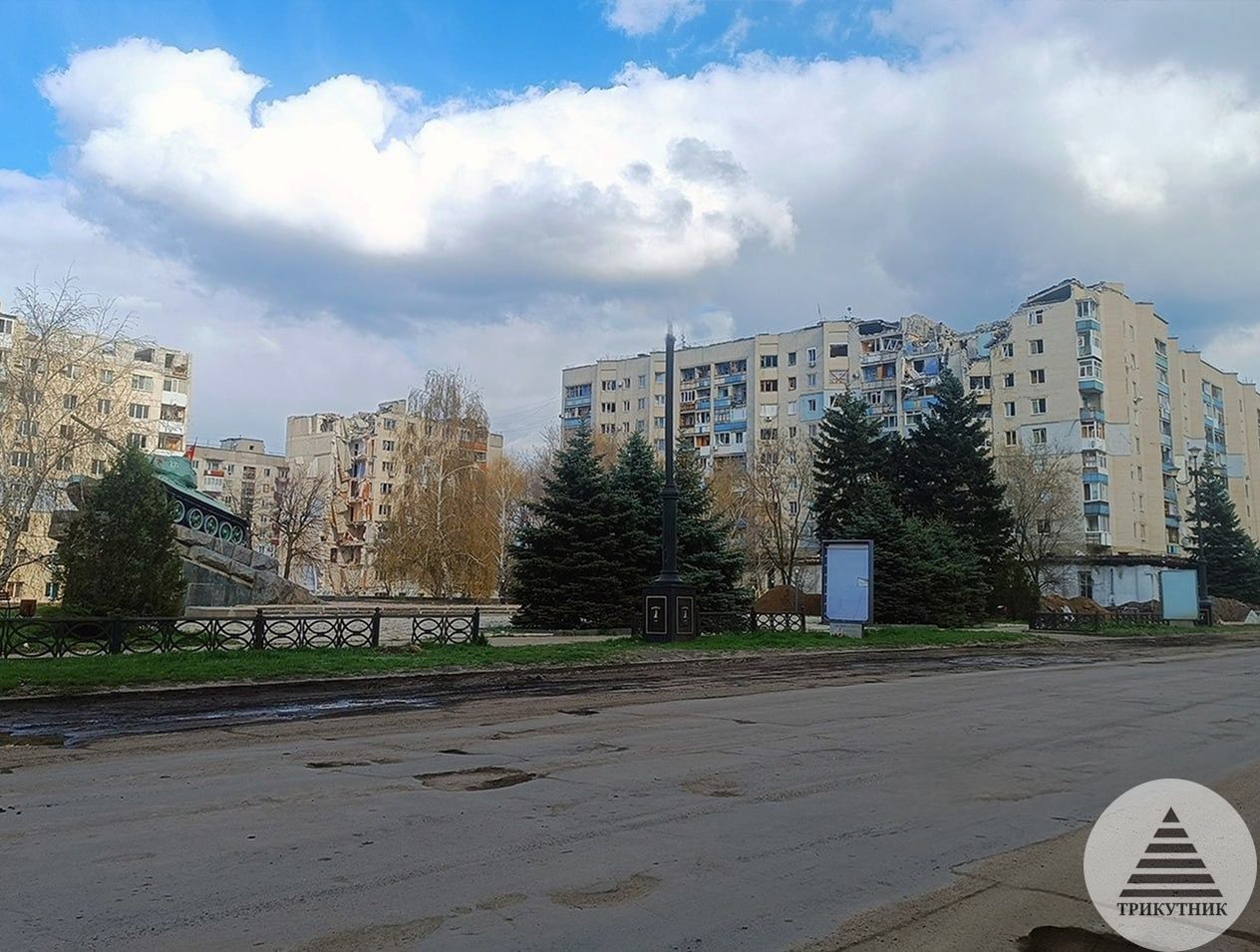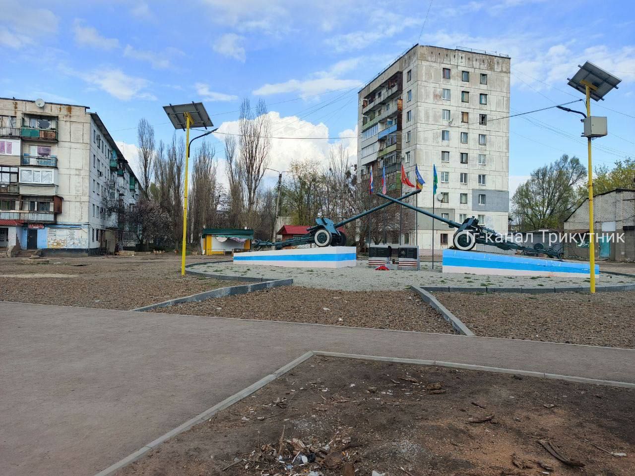 - В районі ГТВ, серед розбитих житлових будинків, встановлено пам’ятник — типовий для окупантів символ "визволення", що дивно контрастує з фоном тотальної руйнації.