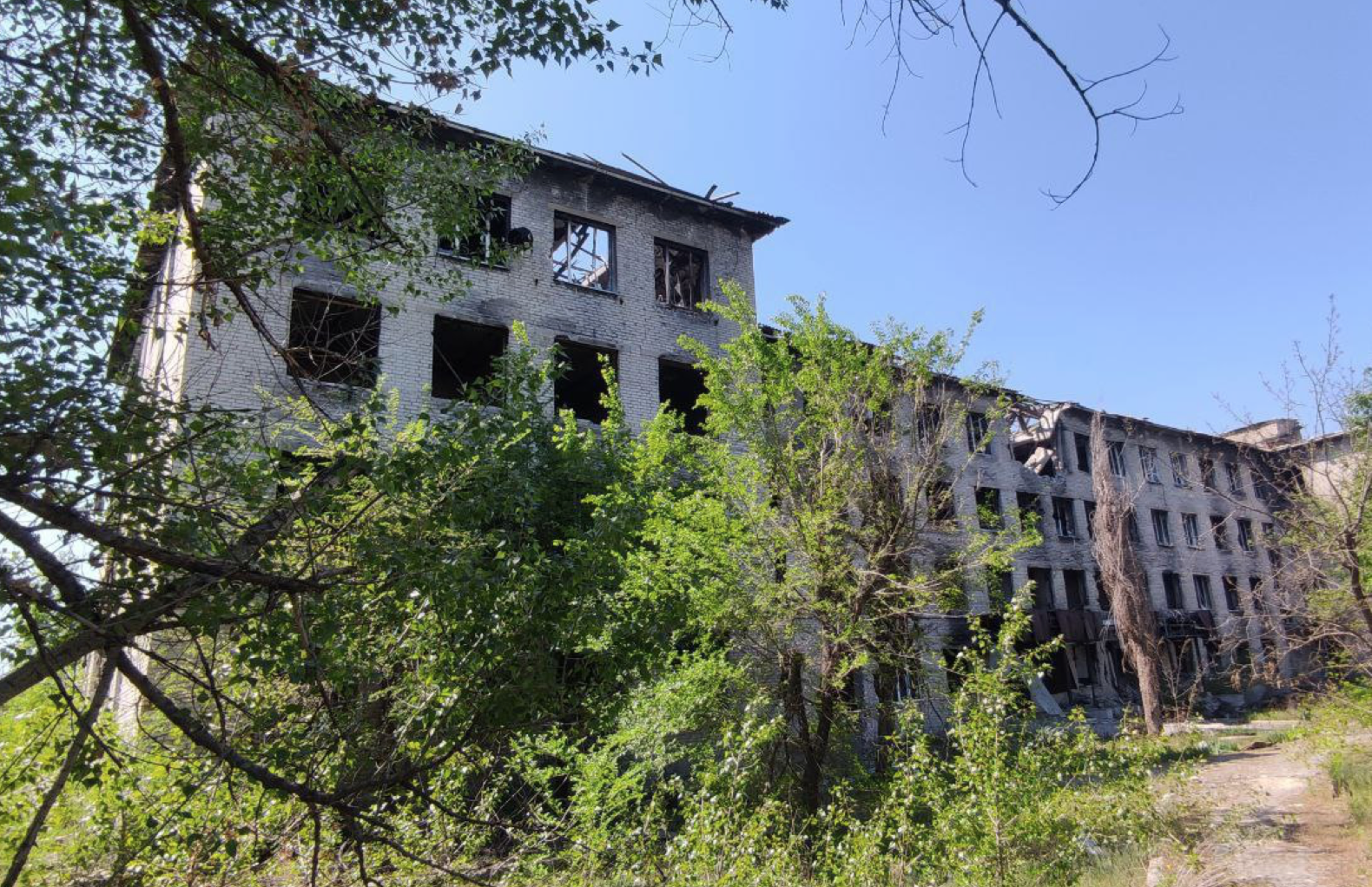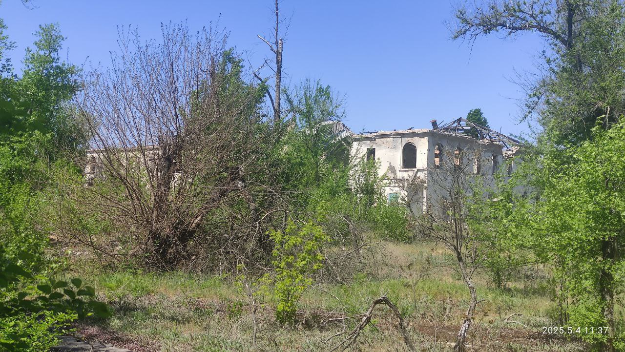 Фото датовані травнем 2025 року. Як можна побачити, будівля сильно пошкоджена. Очевидно, що з моменту окупації ніхто нею не цікавився, ніхто не намагався навести лад. На території навколо будівлі ростуть бур'ян та молоді дерева. Незабаром вхід у будівлю зовсім потоне в кущах.