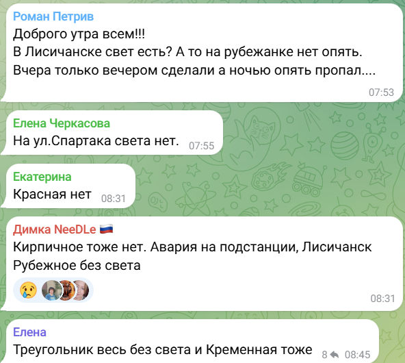Зазначимо, що ще на день раніше, 27 червня, надходили повідомлення про повне відключення електрики в Лисичанську. Причиною також називали аварію на підстанції.