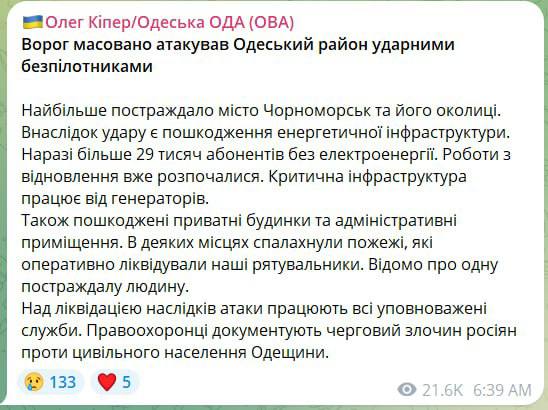 Найбільші руйнування зафіксовано у Чорноморську та його околицях. За словами голови Одеської ОВА Олега Кіпера, без електропостачання залишилося понад 29 тисяч абонентів.