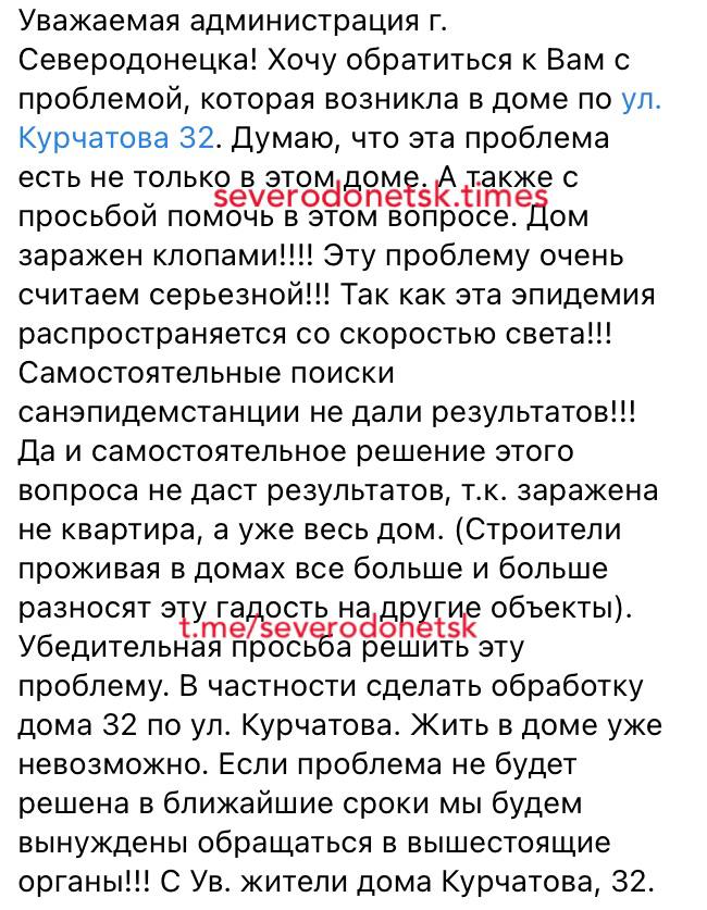 У місцевих пабліках жителі Сіверськодонецька опублікували скарги на катастрофічний стан будинку на вулиці Курчатова, 32. За словами городян, там розгорнулася справжня епідемія клопів.