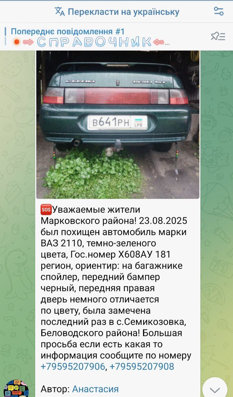Жителі закликають усіх, хто має будь-яку інформацію про темно-зелену ВАЗ-2110 зі спойлером і чорним переднім бампером, повідомляти про це в місцеві чати чи на вказані номери телефонів.