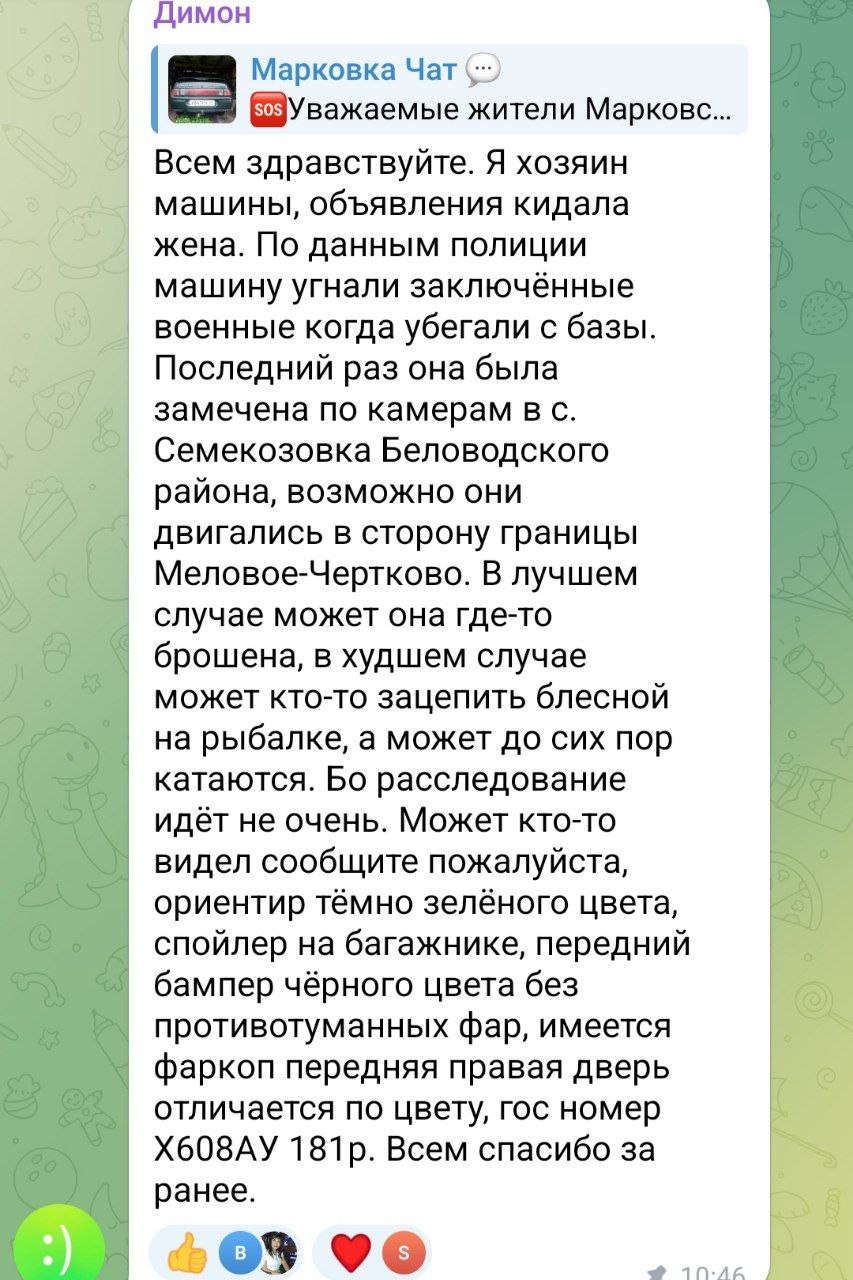 Згодом сам власник уточнив, що за даними так званої "поліції" автомобіль угнали російські військові-заключені, які тікали з військової бази. Камери спостереження зафіксували машину на напрямку до прикордонного пункту Мілове–Чертково.