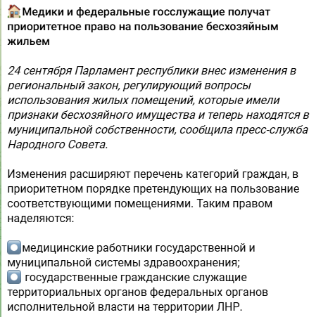 Згідно з новими "правилами", житло, яке окупаційні адміністрації визнають "безхазяйним" і переводять у муніципальну власність, тепер можуть у пріоритетному порядку отримувати: