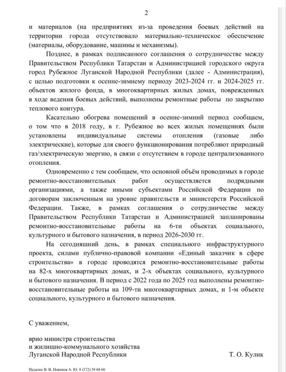 Таким чином, офіційна відповідь підтверджує, що більшість запланованих відновлювальних робіт у Рубіжному заморожені або відкладені, а обсяги фактично виконаних робіт залишаються обмеженими.