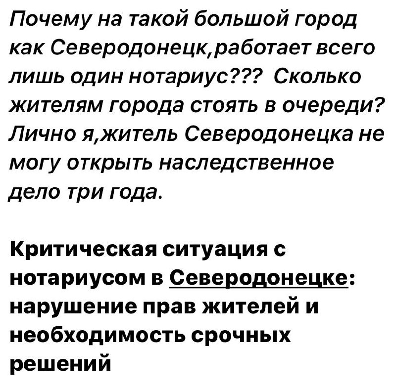 У соціальних мережах ширяться коментарі мешканців тимчасово окупованого Сіверськодонецька, які висловлюють глибоке обурення та стурбованість критичною нестачею нотаріусів у місті. Ситуація, що склалася, призвела до багатогодинних черг, порушення майнових прав та неможливості завершити елементарні юридичні процедури.