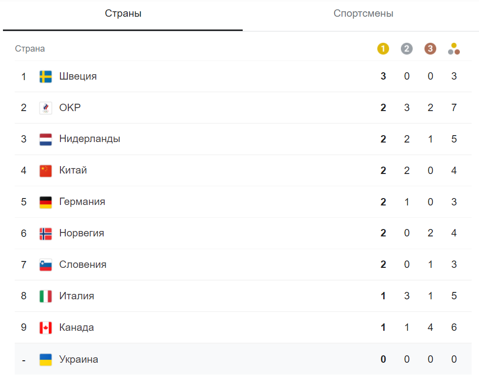 Норвегія, яка ще вчора лідирувала у медальному заліку, опустилася на 6-й рядок. Тепер її випереджають Китай та Німеччина.