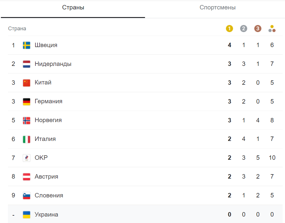 У медальному заліку, як і вчора, лідирує Швеція, у якої вже 4 золоті медалі, 1 срібна та 1 бронзова. На другому місці Нідерланди – 3 золоті, 3 срібні та 1 бронзова медаль. Замикає трійку лідерів Китай, який завоював 3 "золота" та 2 "срібла".