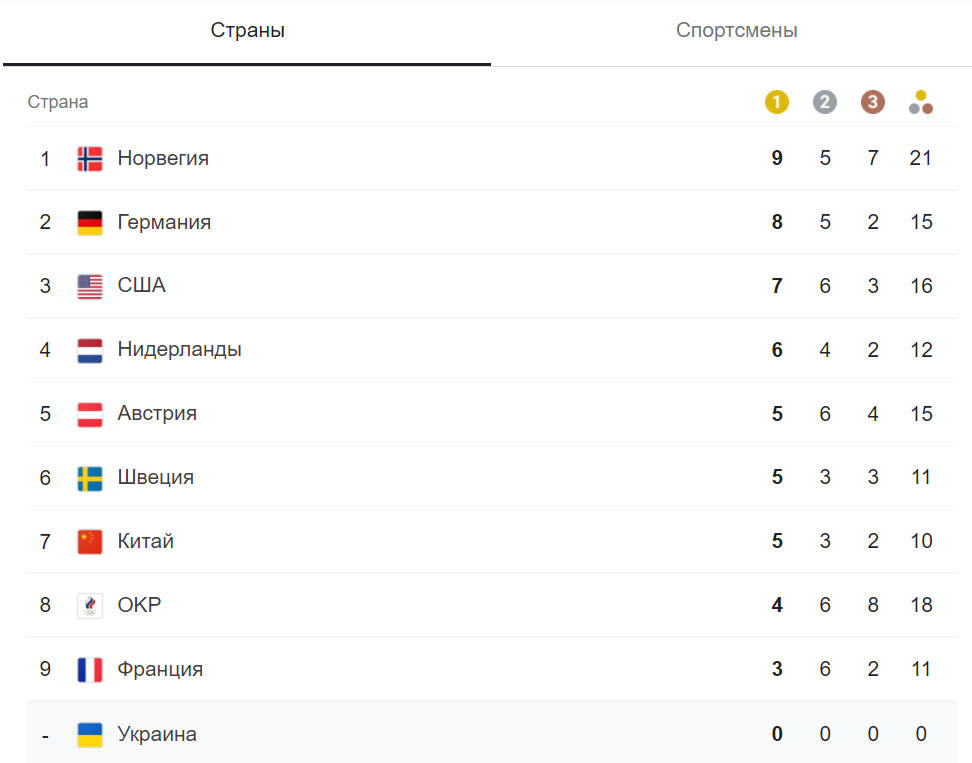 За останню добу медалей у Норвегії не побільшало, але вона зберегла за собою перший рядок у медальному заліку з 9 золотими, 5 срібними та 7 бронзовими нагородами.