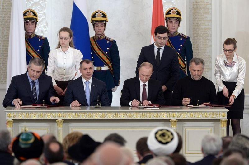Підписання «Договору між Російською Федерацією та Республікою Крим Про прийняття в Російську Федерацію Республіки Крим та утворення у складі Російської Федерації нових суб'єктів» відбулося в Георгіївському залі Великого Кремлівського палацу. Свої підписи під документом поставили президент РФ Володимир Путін, голова Кримської «Ради Міністрів» Сергій Аксьонов, голова «Державної Ради» Криму Володимир Константинов і голова Координаційної ради з організації управління із забезпечення життєдіяльності Севастополя Олексій Чалий.