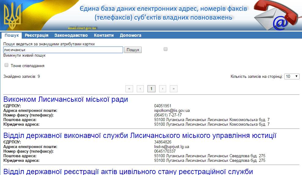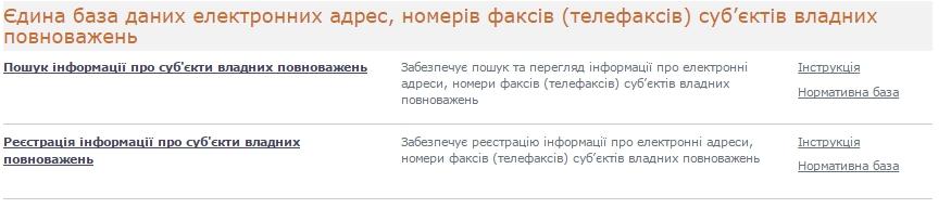 - Єдиної бази даних електронних адрес, номерів факсів (телефаксів) суб'єктів владних повноважень
