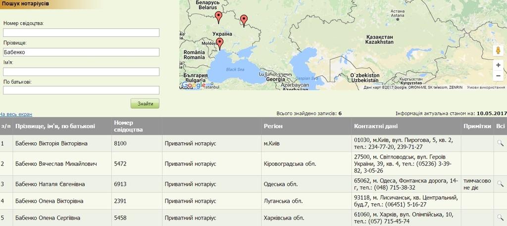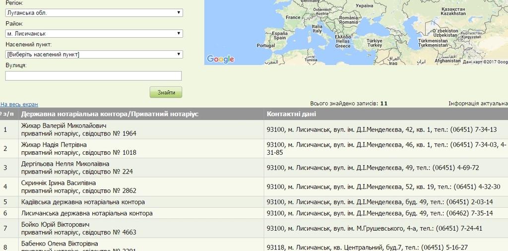 Пошук інформації через веб-сайт здійснюється за адміністративно-територіальним одиницям і назв державної нотаріальної контори