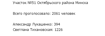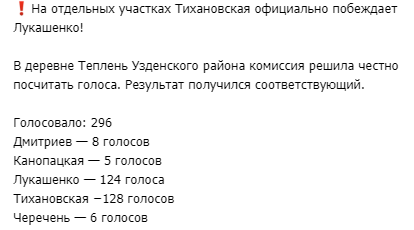 Опозиційні джерела заявляють, що за неофіційними екзит-полам на виборах повинна перемогти кандидат Світлана Тихановська. Про перемогу Тихановської свідчать результати екзит-полів на закордонних дільницях. Крім того, в мережі з'явилася інформація, що, згідно з протоколами, Тихановська офіційно перемагає на окремих дільницях в Білорусі.