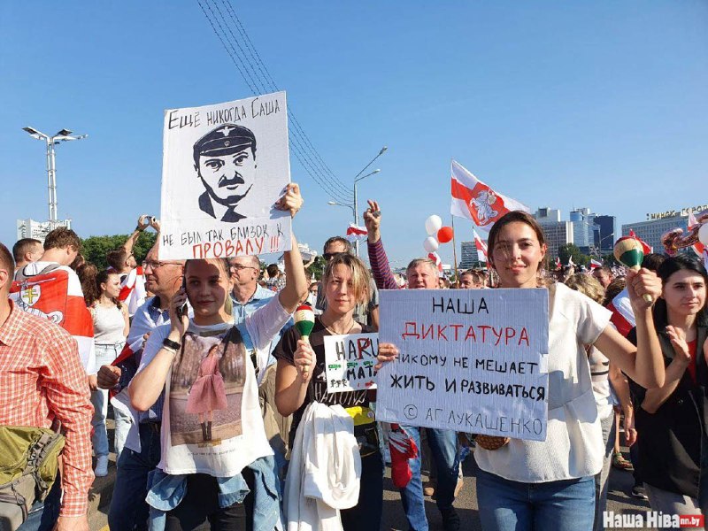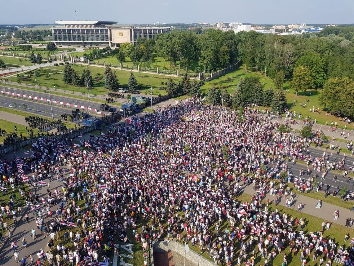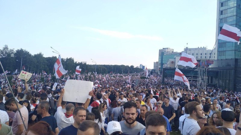 У Мінську в "Марші миру і незалежності" взяли участь близько 100 тисяч осіб, заявляють місцеві телеграм-канали. Протестуючі прямували від стели до Палацу Незалежності - резиденції Лукашенка.