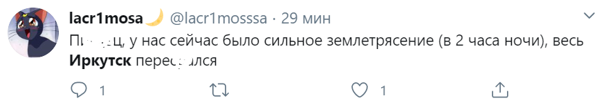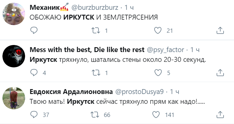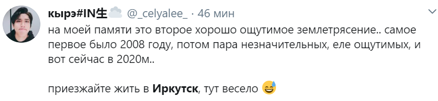 Жителі Іркутської області і Бурятії відчули сейсмічні поштовхи і поділилися в соцмережах своїми враженнями. За словами очевидців, у будинках протягом 30 секунд тряслися стіни. Після першого поштовху через 5 хвилин стався другий, дещо слабше. Коливання відчули навіть на перших поверхах будівель.