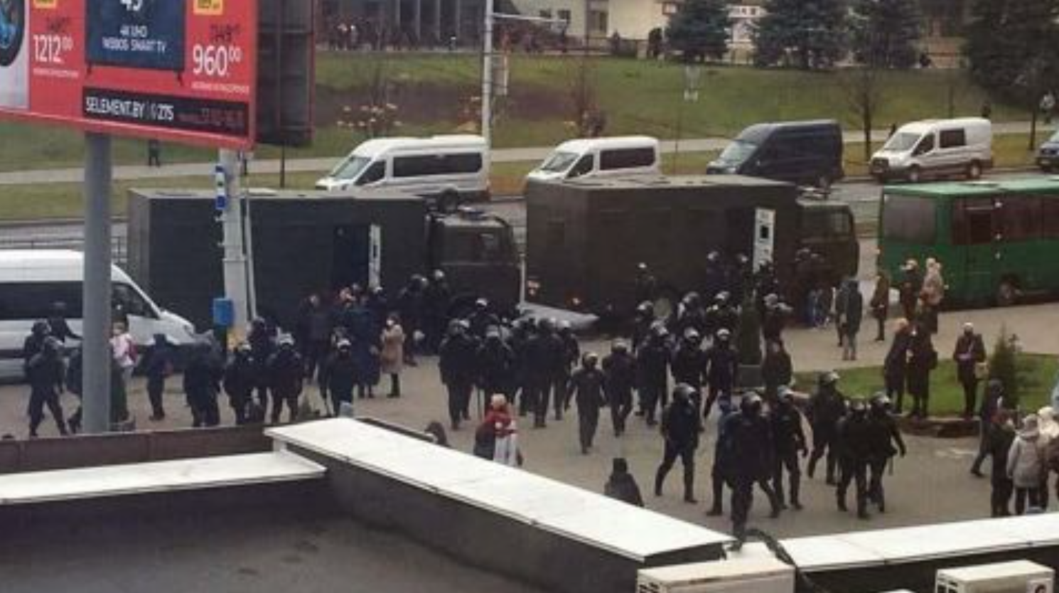 На вулицях Мінська вранці 15 листопада помітили колони військової спецтехніки, які прямували до центру міста. На площі Незалежності почали встановлювати огорожі.
