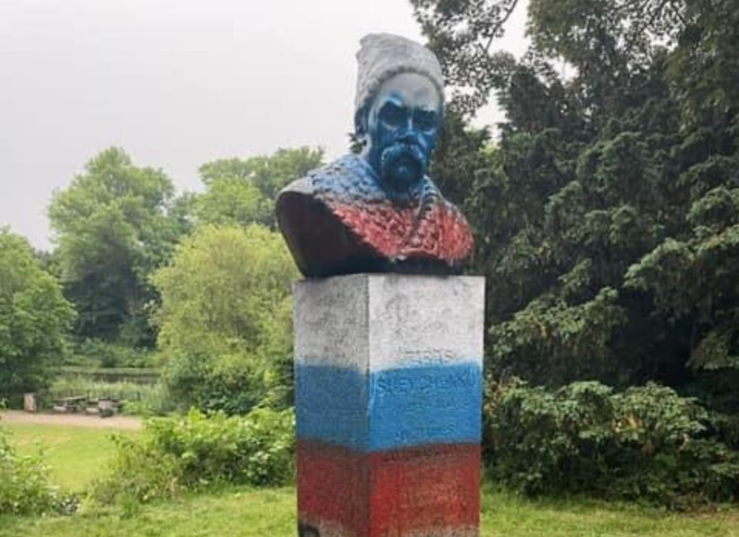 У столиці Данії Копенгагені пам'ятник українському поетові Тарасу Шевченко був розмальований у кольори російського триколору і розписаний пропагандистськими лозунгами окупантів.