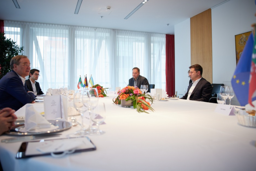 У рамках робочого візиту до Німеччини президент України Володимир Зеленський провів зустріч з прем'єр-міністром федеральної землі Північний Рейн-Вестфалія, головою Християнсько-демократичного союзу Арміном Лашетом.