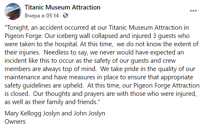 "Зайве говорити, що ми ніколи не думали, що станеться подібний інцидент, оскільки безпека наших відвідувачів та членів екіпажу завжди на першому місці. Ми пишаємося якістю нашого обслуговування та вживаємо заходів для дотримання правил техніки безпеки", - заявили власники музею.