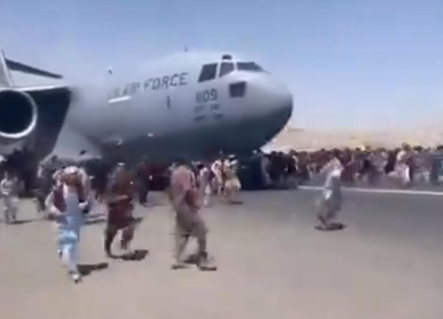 У мережі з'явилися відео, на яких показано, як натовп афганців оточило злітаючий американський літак, кілька людей зачепилися за борт і шасі. На інших кадрах видно, що деякі з них зірвалися, коли літак набрав вже пристойну висоту. Повідомляється, що загинуло як мінімум дві людини.