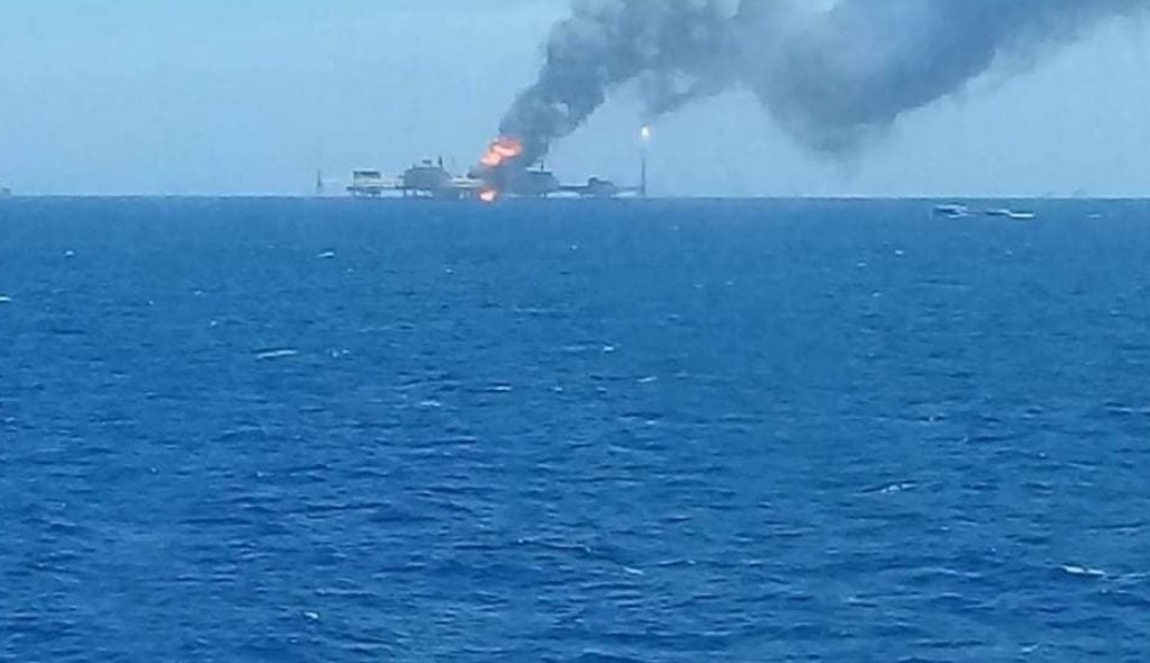 Así se observa el incendio en la plataforma #KuAlfa en la sonda de #Campeche , fuentes extraoficiales reportan 6 personas heridas pic.twitter.com/34rh1XOebP