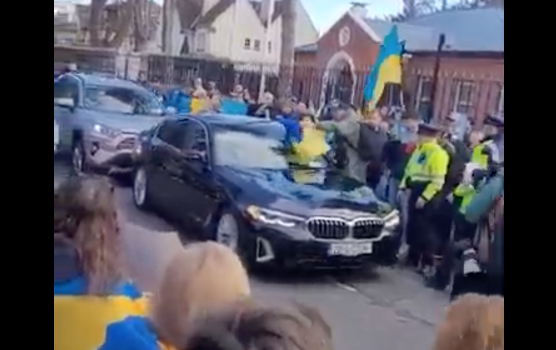 Учасники мітингу заблокували авто посла і накрили його прапорами України. Через якийсь час йому все ж вдалося проїхати.