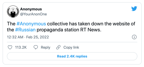 Крім того, хакери Anonymous заявили, що вивели з ладу сайт російського пропагандистського телеканалу RT News.