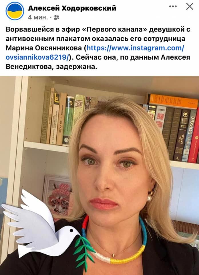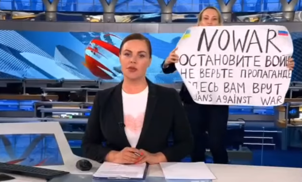 Під час випуску новин за спиною у ведучої раптово з'явилася дівчина з плакатом: "Ні війні. Зупиніть війну! Не вірте пропаганді! Тут вам брешуть! Росіяни проти війни".