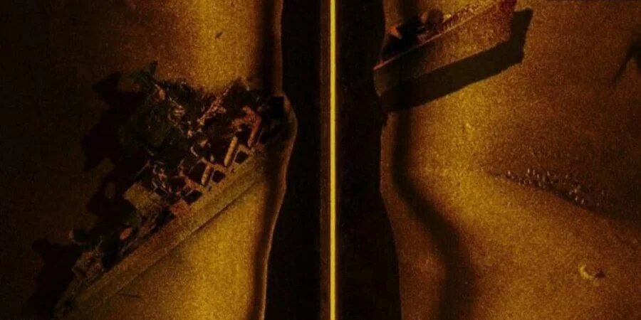 На фотографіях видно, що російський крейсер розламався на дві частини, які лягли на дно Чорного моря лівим бортом.