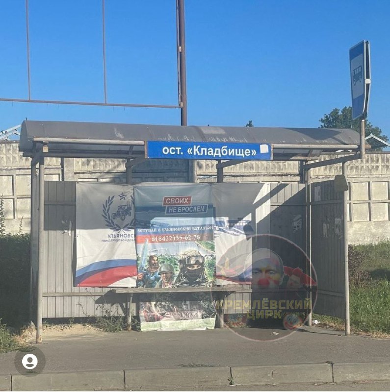 Росія знову відзначилася "креативністю" у виборі місця для рекламування військової служби. Плакат із запевненням "Своїх не кидаємо" розмістили на зупинці "Цвинтар" у місті Ульяновськ.