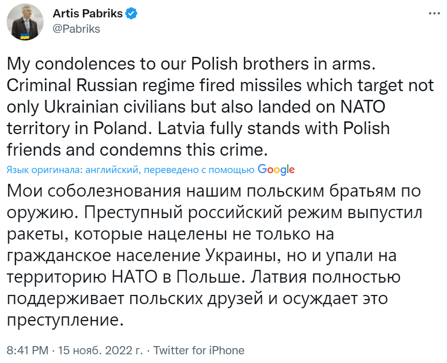"Мої співчуття нашим польським братам по зброї. Злочинний російський режим випустив ракети, які націлені не лише на цивільне населення України, а й впали на територію НАТО в Польщі. Латвія повністю підтримує польських друзів та засуджує цей злочин", - написав Пабрікс.