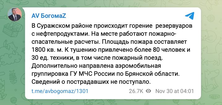 У ніч проти 30 листопада в Суразькому районі Брянської області РФ спалахнула масштабна пожежа на нафтобазі.