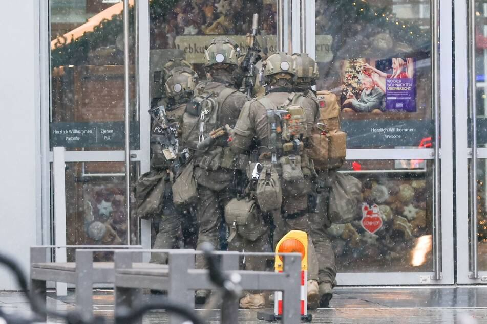 Пізніше злочинець проник у торговий центр і забарикадувався у підсобці аптеки. Попередньо він міг взяти кількох людей у заручники.