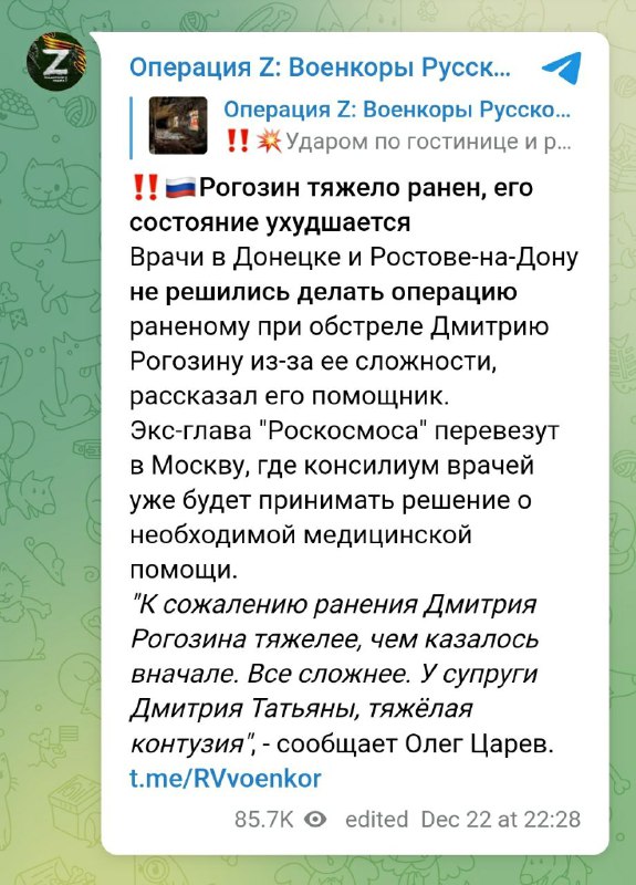 "Лікарі в Донецьку та Ростові-на-Дону не зважилися робити операцію пораненому під час обстрілу Дмитру Рогозіну через її складність. Раніше важче, ніж здавалося спочатку. Все складно", - йдеться в повідомленні.